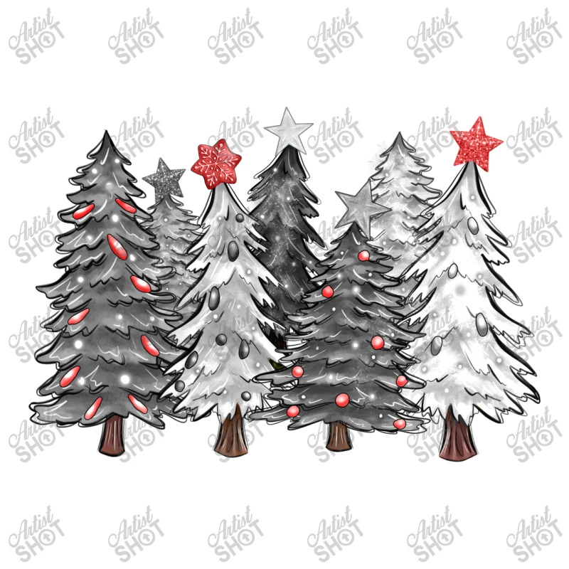Plot Printing Consists of both Flock and Flex Print, This process transfers your artwork “Black And White Christmas Trees With Lights” from a special foil through an immense amount of pressure and heat. Flex images are smooth, a little plastic like and a tad bit glossy. Flock images have a fuzzy velvet-like texture and appear slightly more elevated. Think of drawing just the shadows and how that would appear without color. 3 colors plus the color of the garment itself is used to print.