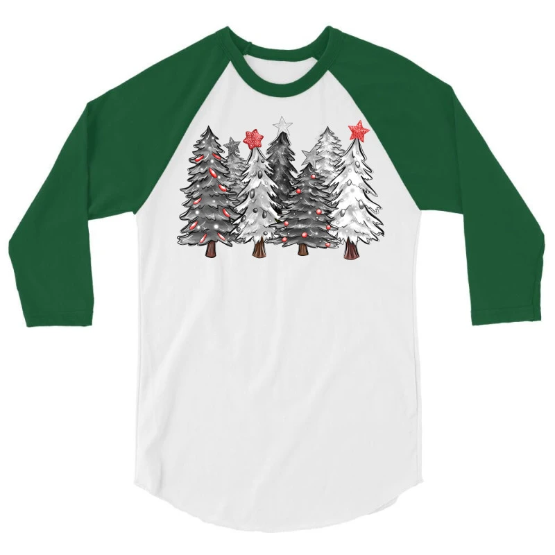 Digital printing is an amazing process that involves your artwork “Black And White Christmas Trees With Lights” being processed by a computer and then printed directly onto the surface of your product. Digital printing is not a heat transfer or applique, as the ink directly adheres to the fabric of your shirt. Each printing process has its strengths, and our artwork team will weigh these when deciding which to use for your art.