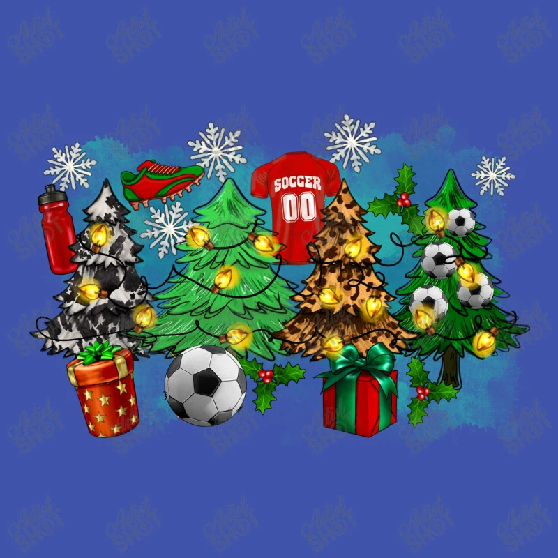 Digital printing is an amazing process that involves your artwork “Christmas Trees With Soccer” being processed by a computer and then printed directly onto the surface of your product. Digital printing is not a heat transfer or applique, as the ink directly adheres to the fabric of your shirt. Each printing process has its strengths, and our artwork team will weigh these when deciding which to use for your art.