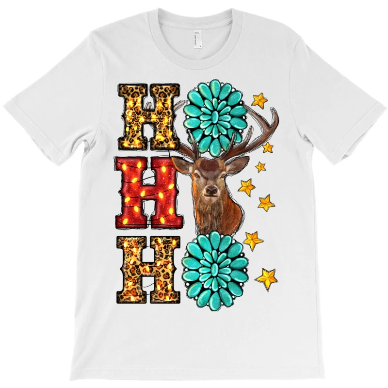 Digital printing is an amazing process that involves your artwork “Gemstone And Reindeer Christmas Ho Ho Ho” being processed by a computer and then printed directly onto the surface of your product. Digital printing is not a heat transfer or applique, as the ink directly adheres to the fabric of your shirt. Each printing process has its strengths, and our artwork team will weigh these when deciding which to use for your art.