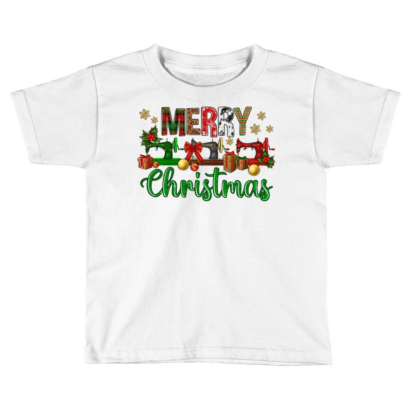 Digital printing is an amazing process that involves your artwork “Merry Christmas Sewing Machine” being processed by a computer and then printed directly onto the surface of your product. Digital printing is not a heat transfer or applique, as the ink directly adheres to the fabric of your shirt. Each printing process has its strengths, and our artwork team will weigh these when deciding which to use for your art.