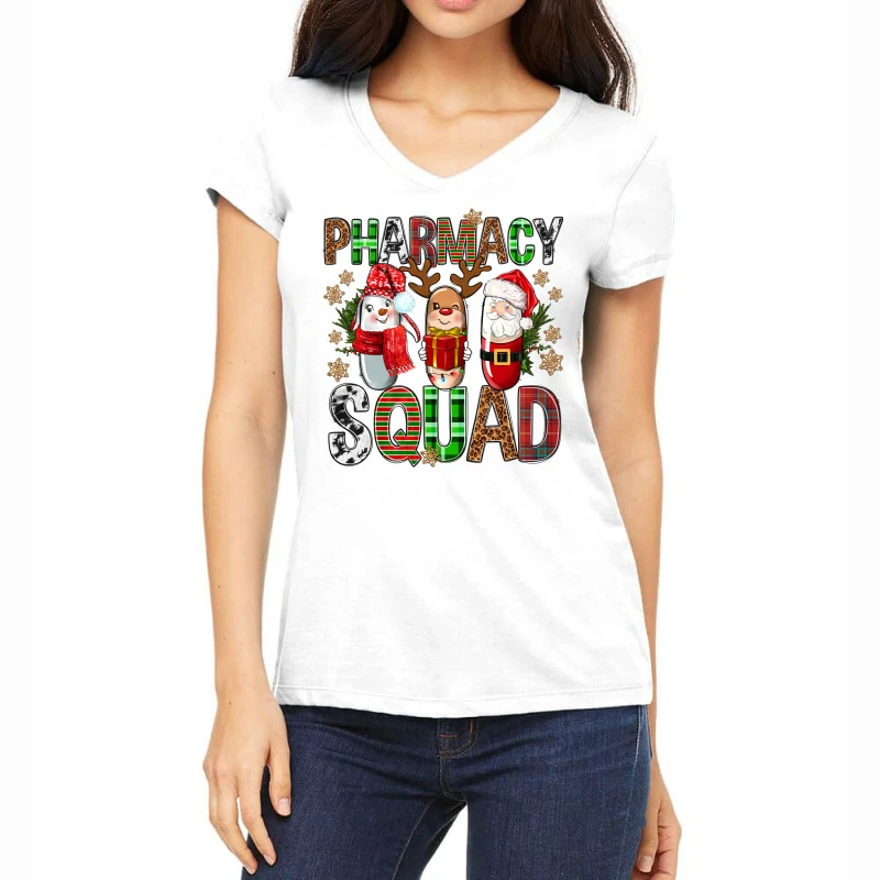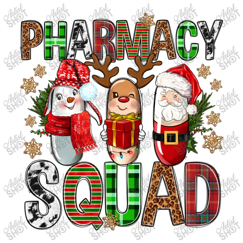Digital printing is an amazing process that involves your artwork “Pharmacy Squad Christmas” being processed by a computer and then printed directly onto the surface of your product. Digital printing is not a heat transfer or applique, as the ink directly adheres to the fabric of your shirt. Each printing process has its strengths, and our artwork team will weigh these when deciding which to use for your art.